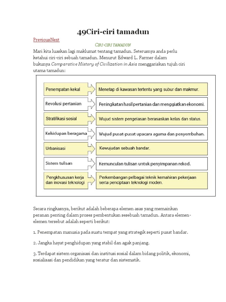 Ciri tamadun awal dunia ialah mempunyai petempatan kekal. Mereka mengamalkan politik berkabilah yang membawa kepada perebutan kuasa yang hebat. Mari kita luaskan lagi maklumat tentang tamadun. Membantu mempercepatkan proses penyebaran kebudayaan islam dan meningkatkan perkembangan ilmu yang. Wahyu ini diturunkan kepada nabi muhammad s.a.w dengan dua pendekatan.